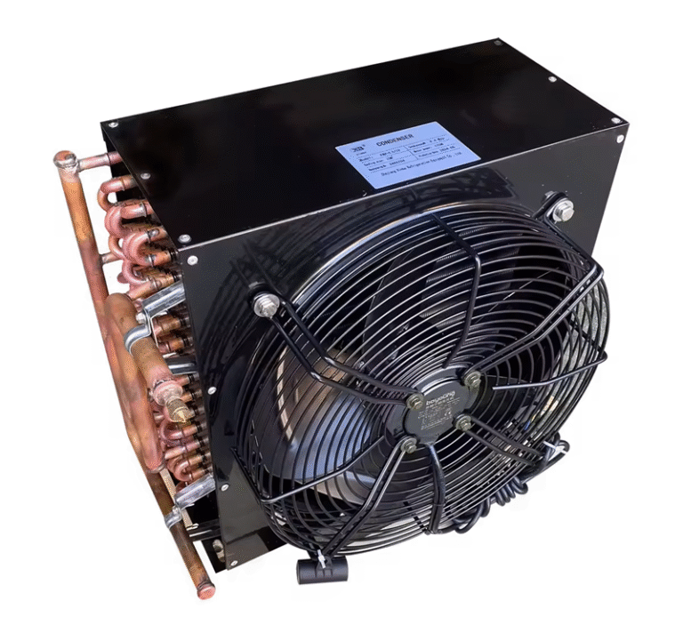 Condensers and their fans release heat removed from the inside the trailer to the external environment. These components are very similar to what is used with nearly all units made for trailers. The difference with electric reefers is that they use a drive motor fed by AC electric current.
